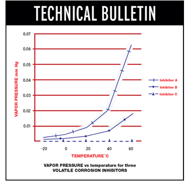 Armor Protective Packaging® mixed inhibitor technology provides a range of vapor pressures. High vapor pressure VCI (Inhibitor A) volatizes more rapidly to provide protection as quickly as possible. The lower vapor pressure VCIs (Inhibitor B and Inhibitor C) have low enough vapor pressures to sustain protection over a long duration.