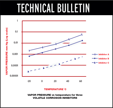 Because the vapor pressure changes dramatically with changes in temperature, the relative vapor pressures can best be viewed on a logarithmic scale. The following graph depicts the temperature/vapor pressure relationship for the three inhibitors utilizing a log scale for vapor pressure.