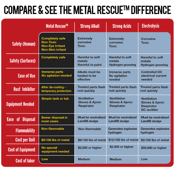 Metal Rescue® Rust Remover BATH is your clean, safe and easy solution to removing rust from iron and steel. Metal Rescue BATH utilizes a unique and selective chelating agent to remove rust (iron oxide) without posing any health, safety or environmental concerns. Metal Rescue BATH is safe on everything except rust! Just Soak, Check, Rinse/Dry. It’s THAT easy!
